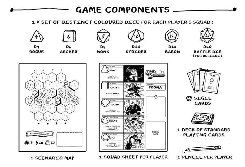 Hex Barons is a print and play squad-building strategy game for two players (ages 8+, 30-45 min) featuring dice-as-units, tactical cardplay, and modular scenario maps.